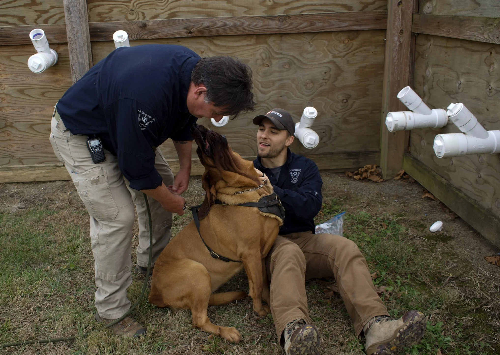 Trainer Bryan Pardoe prepares Kermit, often called Kermi-LouLou, for trailing by adjusting her harness. Trailing is a form of tracking that K9s, specifically bloodhounds, specialize in by picking up odors from the ground by a person’s footsteps. These dogs are kept on leashes with their noses low to the ground to follow a missing person’s every move.