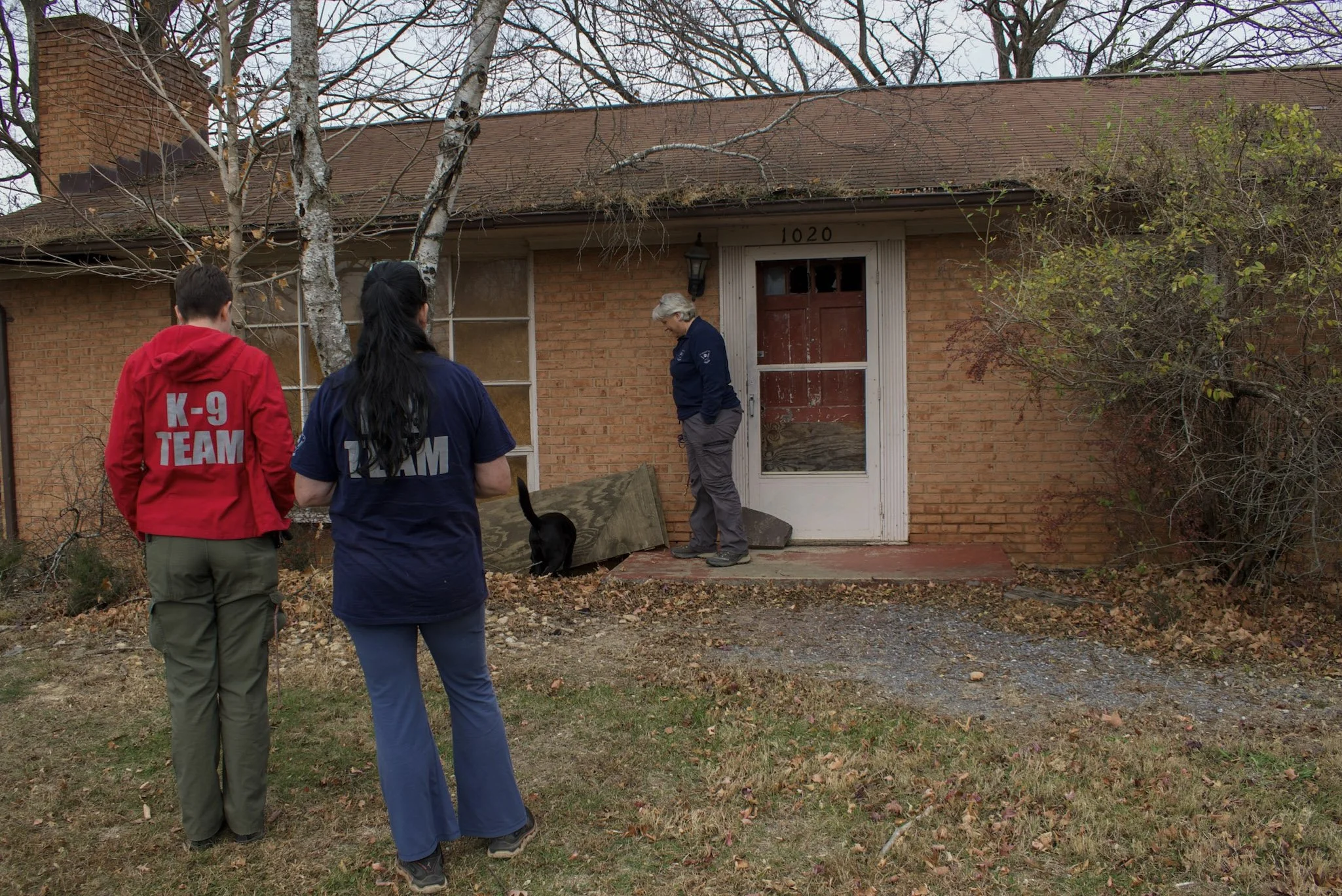 Sumac, a K9 Black Lab, is practicing airscenting to hunt for hidden simulated human remains under the house. Airscenting is a method of search and rescue that trains dogs to pick up human scents and odors without needing subjects’ samples to find them. Wind carries the scent indefinitely, and the K9s use it to find people in any terrain.