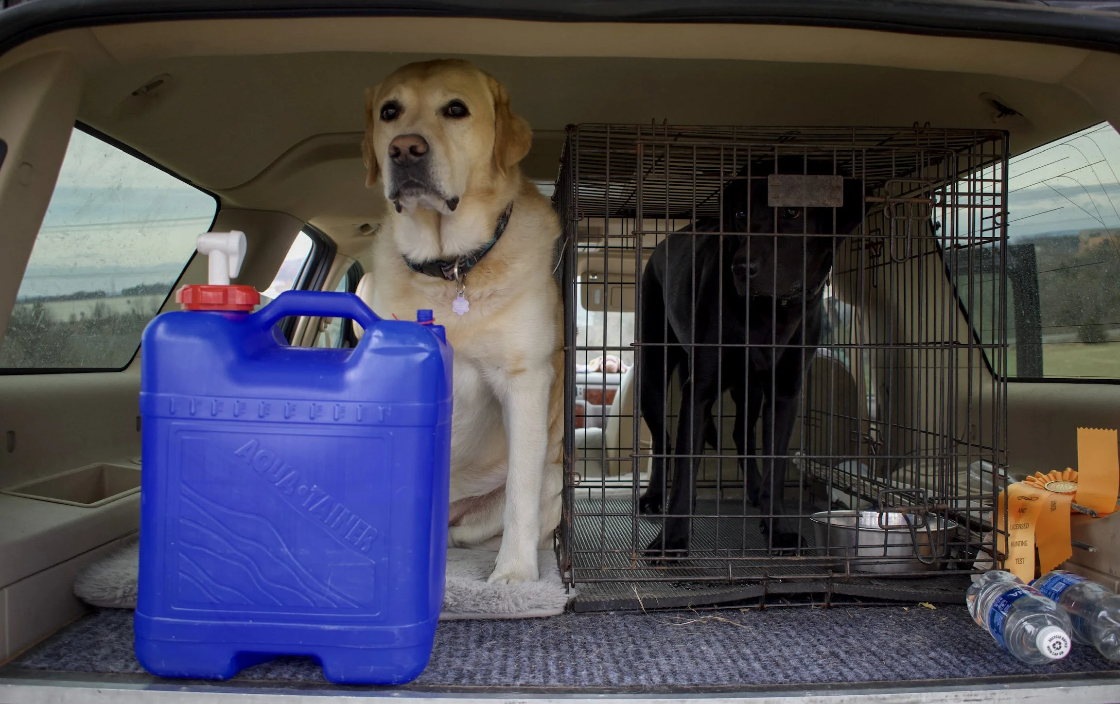 Golden retriever, Semaus, and recently certified black lab, Sumac, observing the training from the back of a trainer’s car.