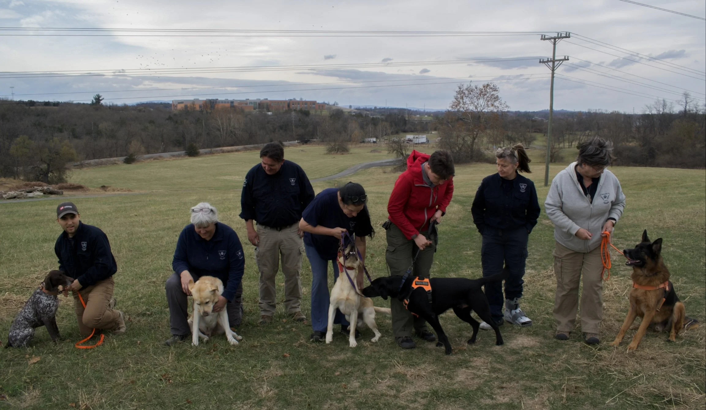 Members of the Blue and Gray Search Rescue Dog team. Robert Vasinko with June (far left), Kathleen Connor with Seamus, Bryan Pardoe, Allyson Lee with Floyd, Wren Walker with Sumac, Misty Sampson and Debby Thompson with Orion (far right).