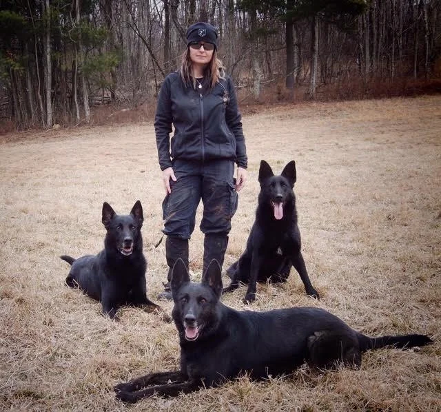 Misty Sampson, president of Blue and Gray Search and Rescue, with her K9s Took, Ditto and Kitty, after a training session in 2014.