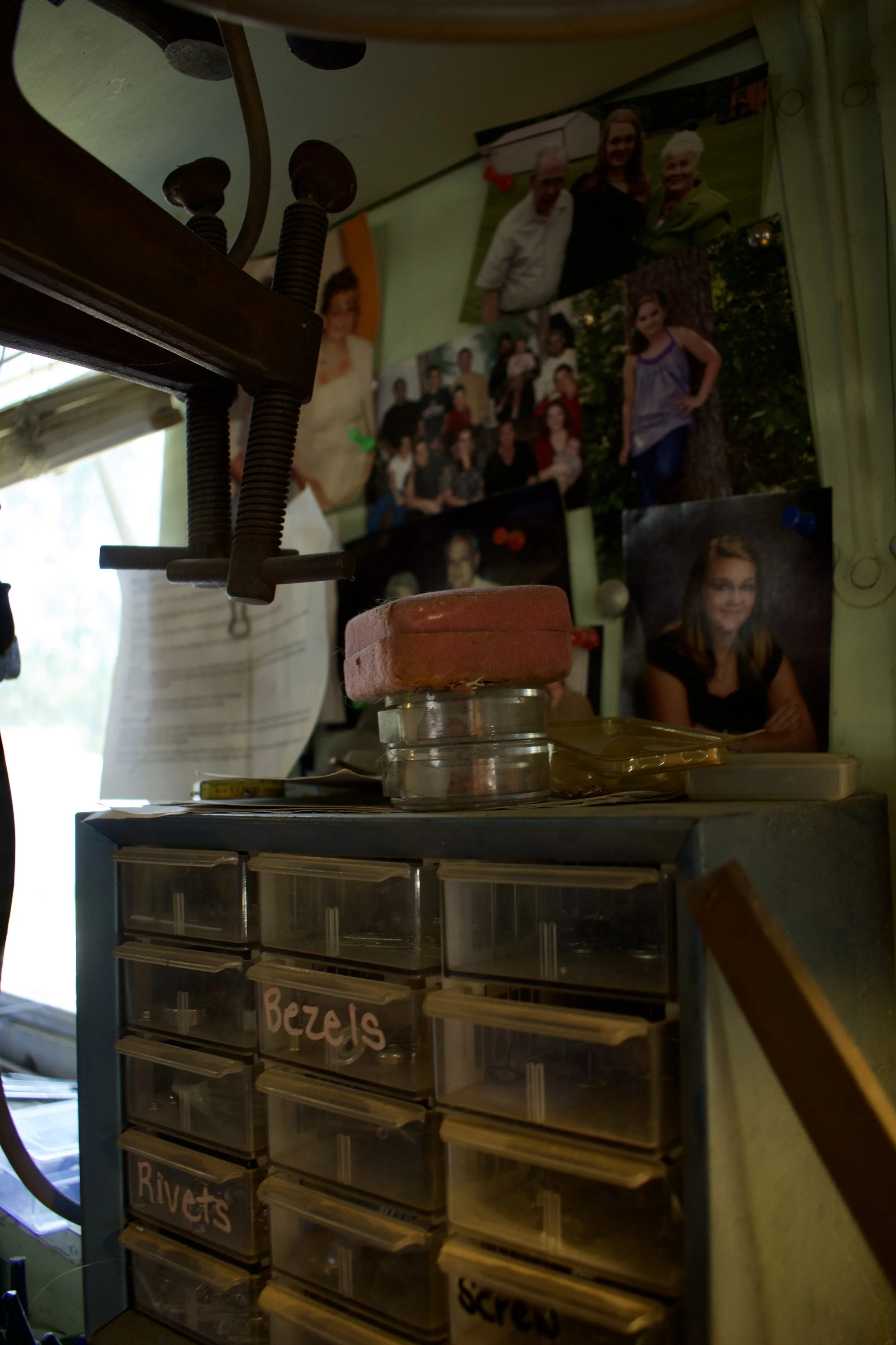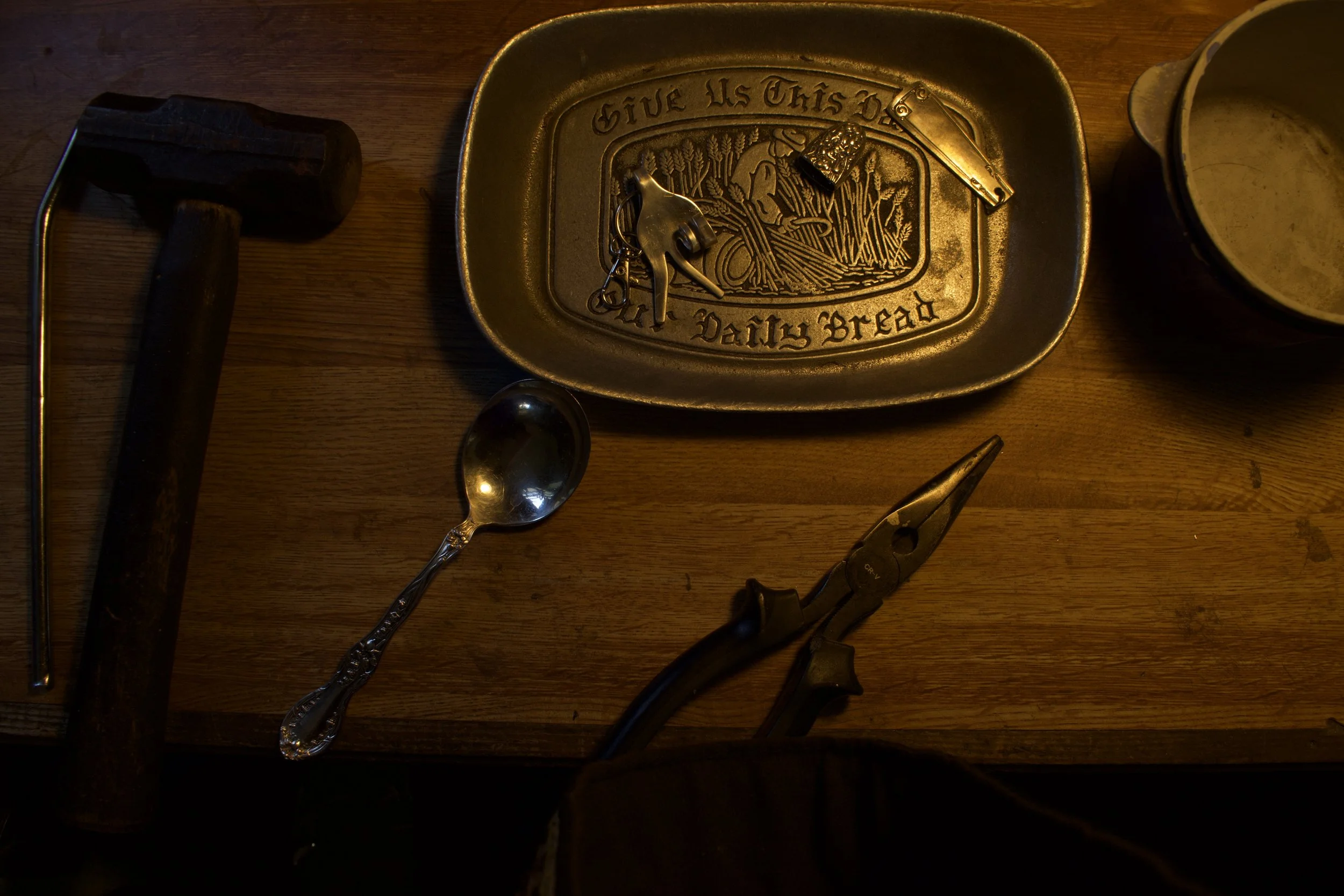 Hoerner is an antique artist who repurposes rusty and tarnished metals into sculptures, jewelry, keychains and other miscellaneous household items. Her process is far from delicate, as she braces herself before she hammers generations of spoons, files down sharp minerals and shaves her pieces to enhance their shine.