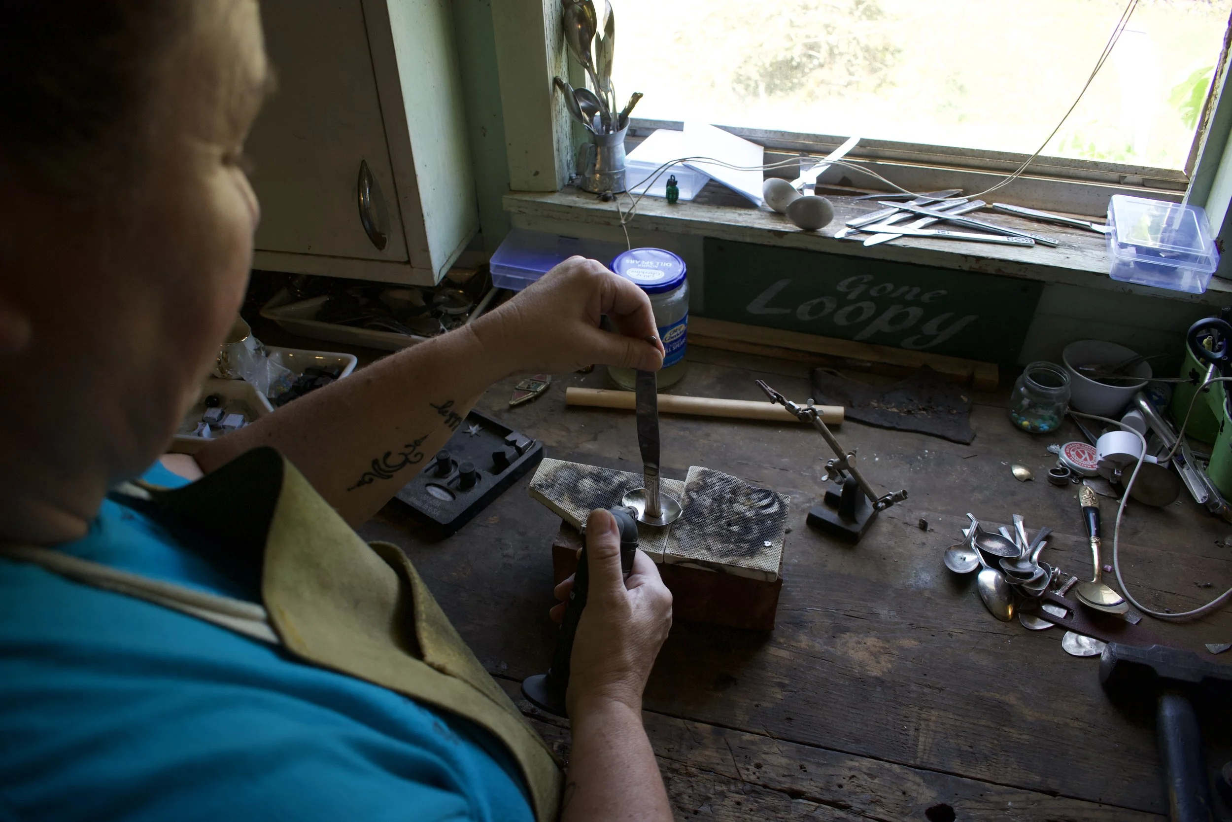 Out of all the random collections of silver antiques in her studio – old watches, recycled tin cans, computer parts and old silverware – Bridget Hoerner’s laugh is what takes up the most space, as she strategically turns trash into an array of irreplicable artwork. Since 2007, her business, “Gone Loopy” has transformed the dusted cutlery in cupboards into one-of-a-kind pieces of art.