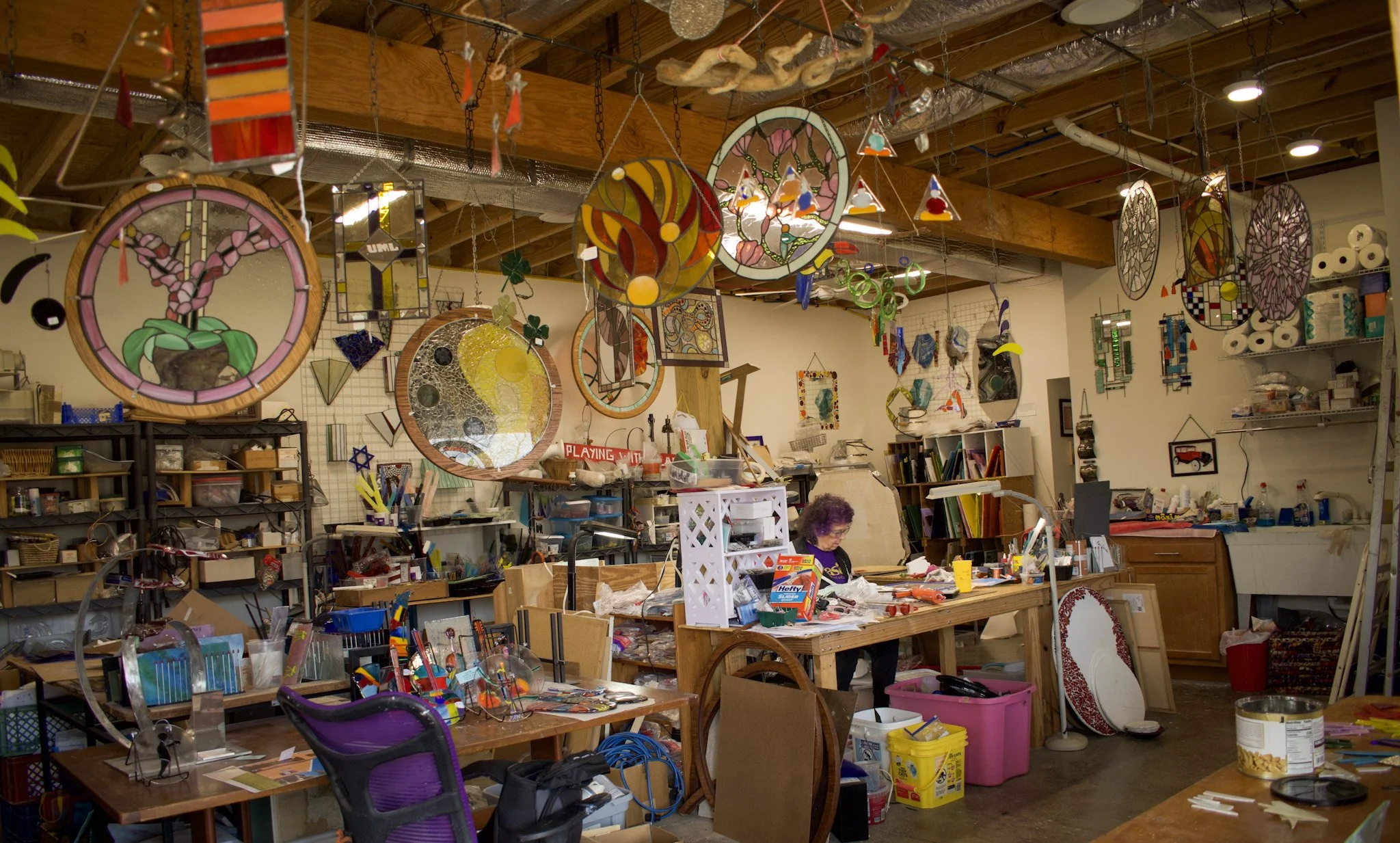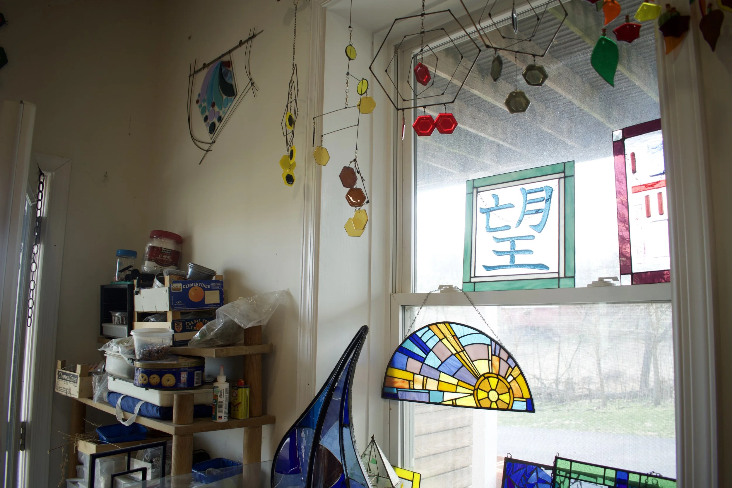 Barbara Camph sits at her cluttered desk filled with a variety of glues, copper wires, screws and bolts, scrap paper, rulers and four Chinese food boxes, each containing color coded pieces of untamed glass. Within this sea of sharp objects, plastic bags and pliers, Camph combines the miscellaneous into her life’s work—mosaics and stained glass.